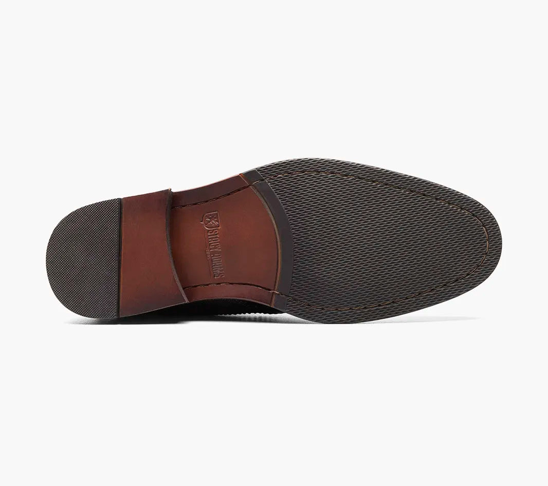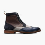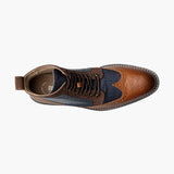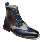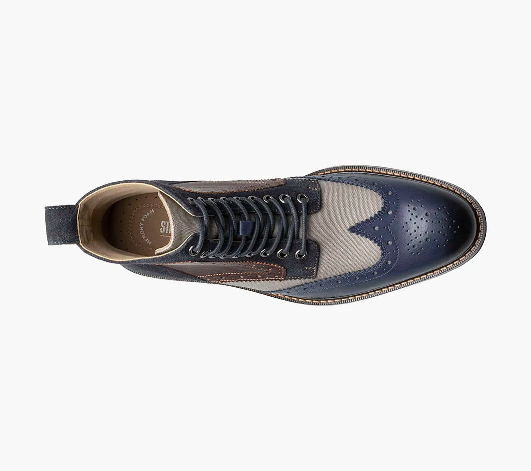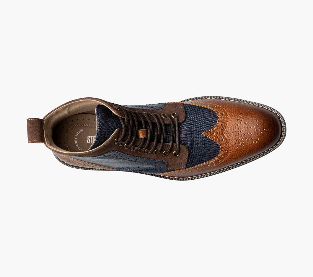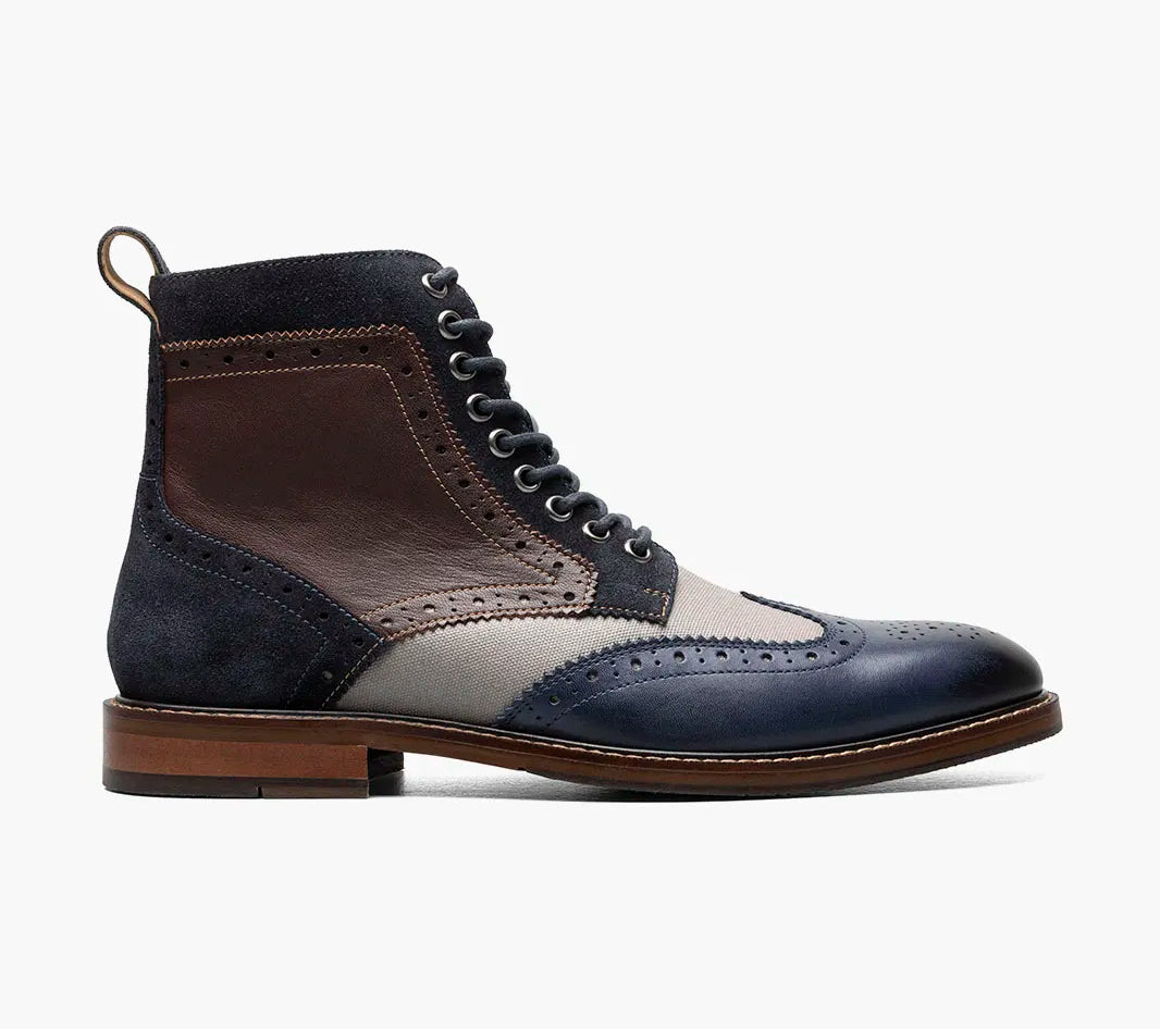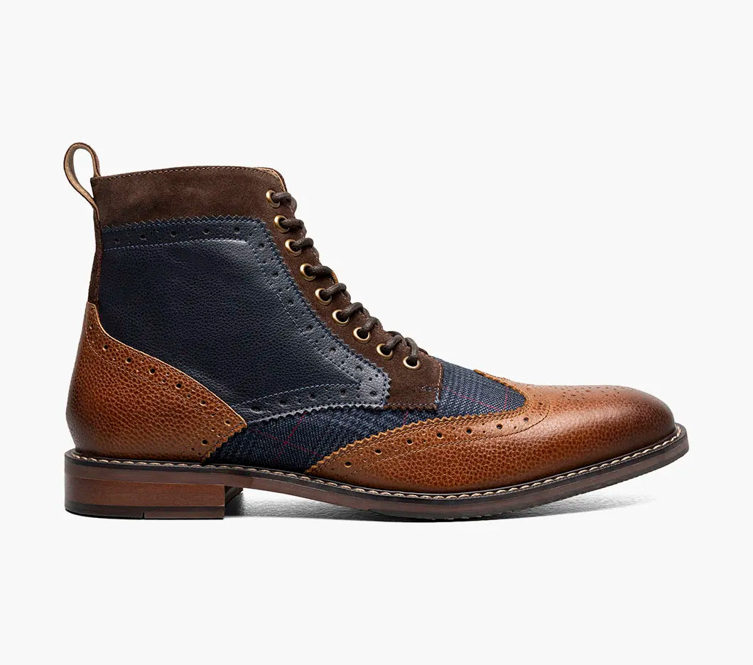 The Stacy Adams Finnegan Wingtip Lace Up Boot features a thoroughly contrasting modern mix of colors, materials, and textures. Add in the eye-catching perfin details and the stacked heel and you have a boot that is sure to turn heads.
